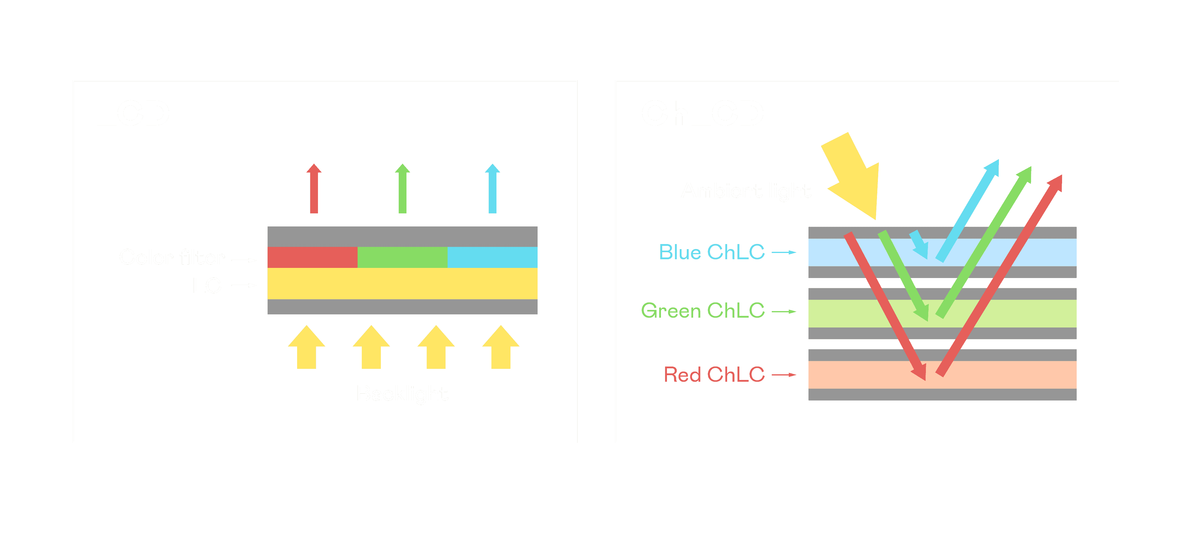 ChLCD 胆固醇液晶就如同纸张一样,,透过反射环境光来显示影像,,因此长时间观看不易造成人眼视觉疲劳,,,可达到护眼效果。。。当处于户外阳光下使用,,,LCD 影像容易失真而不易观看,,,,但胆固醇液晶仍可维持较佳的影像品质。。。